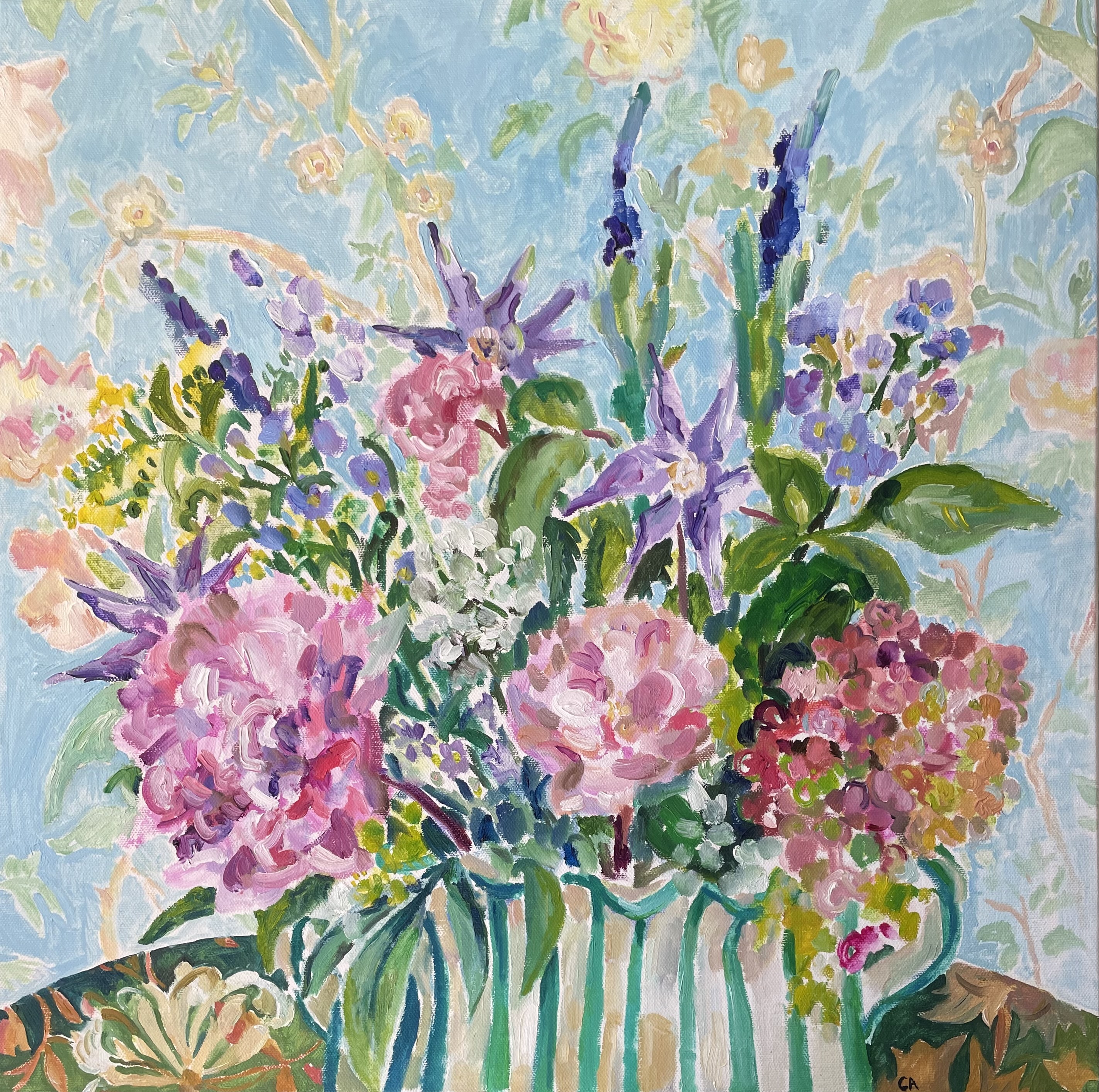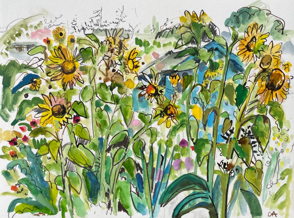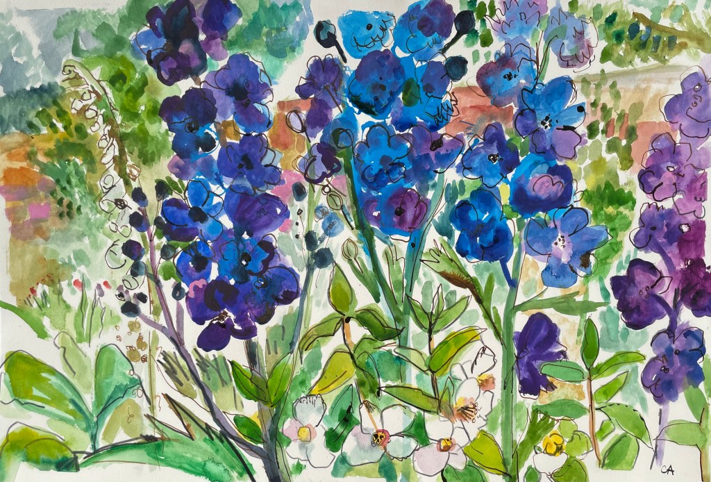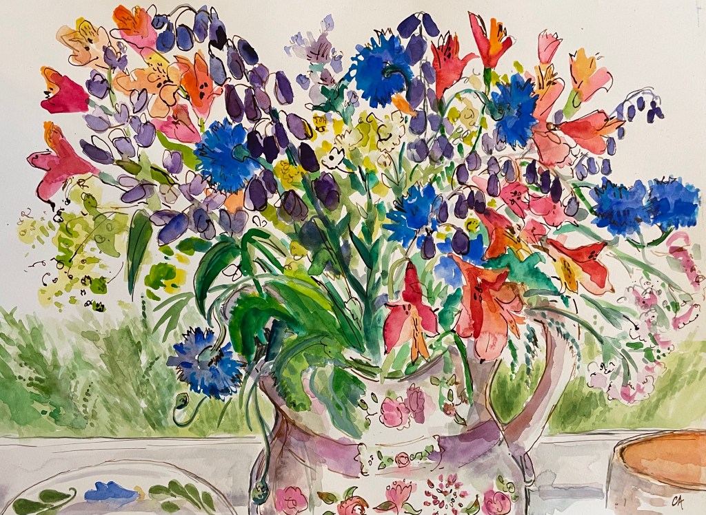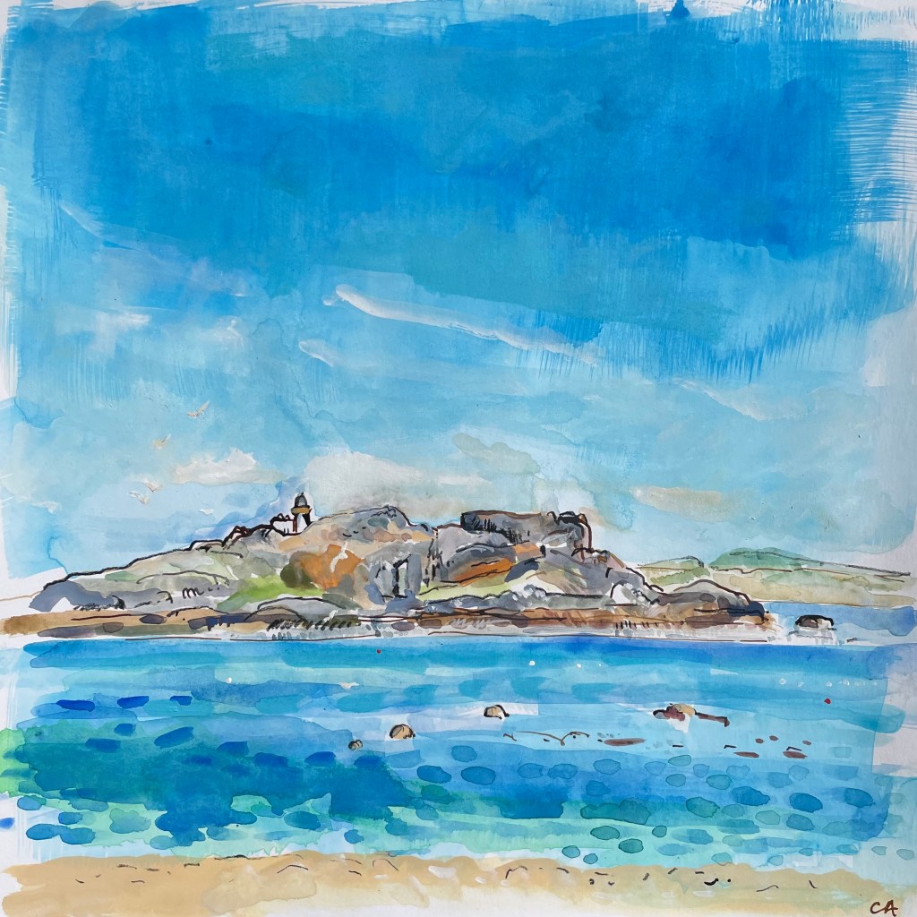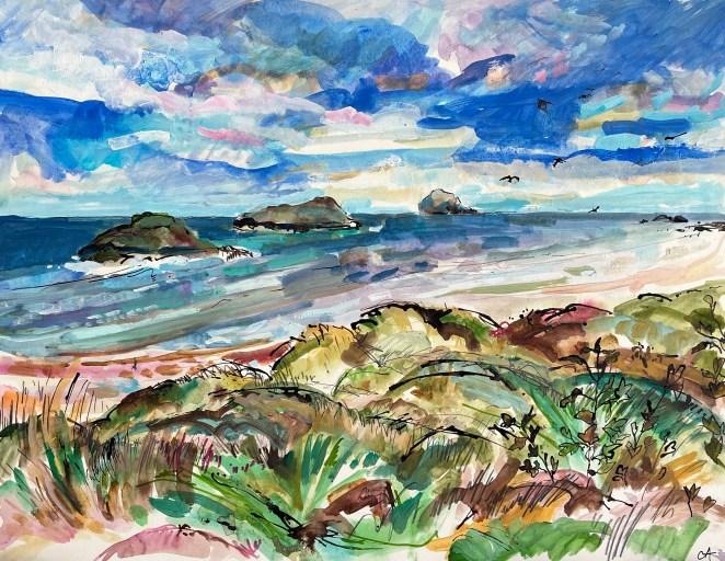 The ever shifting moods of the Scottish climate presents an intense experience and painterly challenge as slate grey skies become saturated and clear to the perfect blue and every hue in between. Clare uses lively brushstrokes and rich colour in an attempt to capture something of this essence. Flowers and grasses commonly work their way into the foreground.